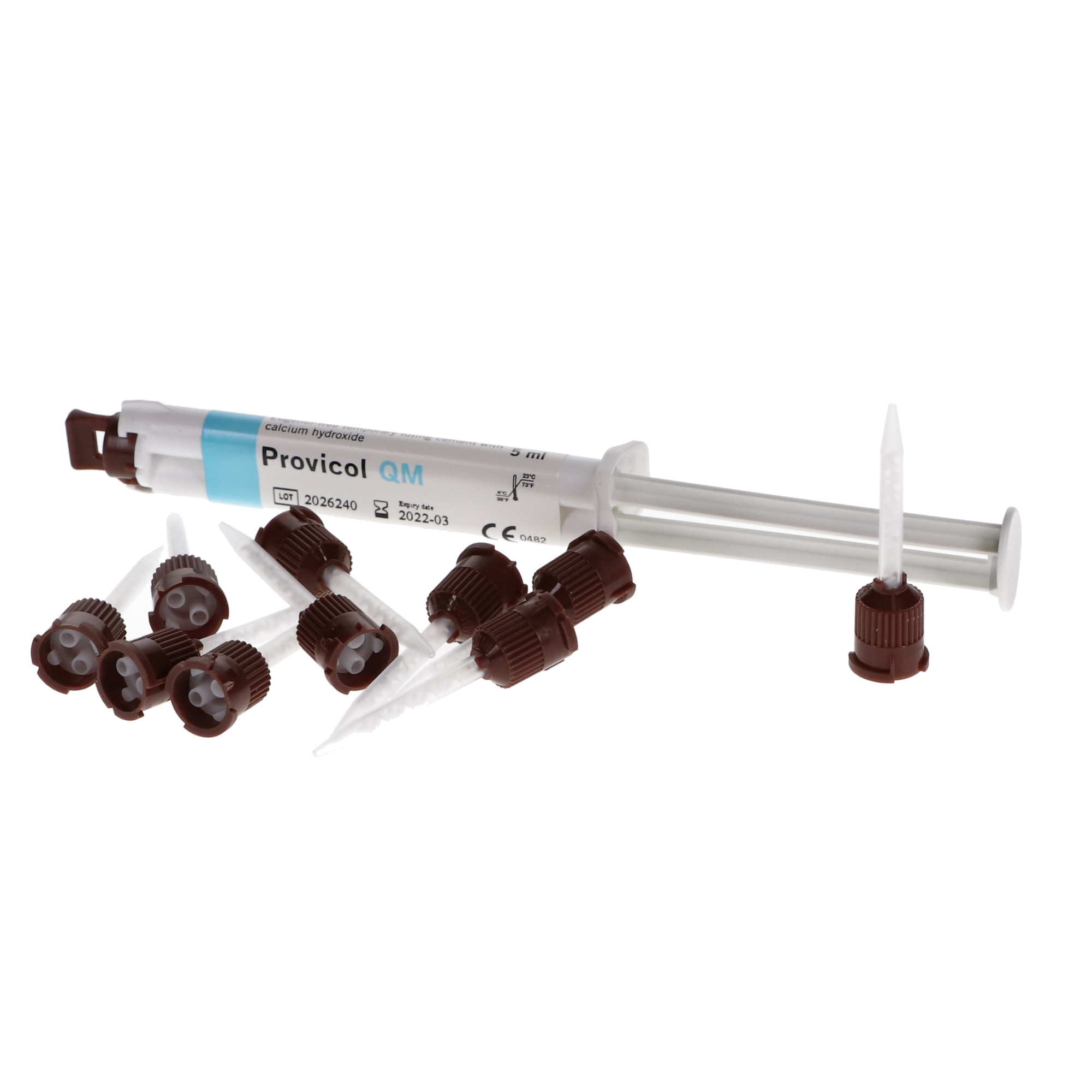 Provicol QM temporary cement is eugenol-free and contains calcium hydroxide. Calcium hydroxide is dispensed through an instant mix syringe and produces a bacteriostatic effect to minimize sensitivities.
